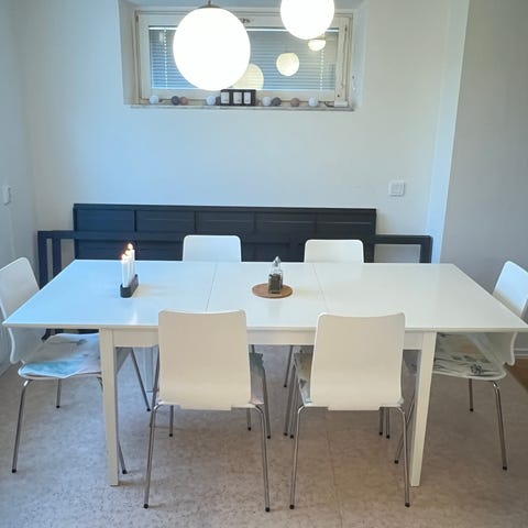 Säljer 5 st Kuleskog bord (180 x 75 cm) och 31 st matchande stapelbara stolar i sandfärgat tyg från Jysk. Tar väldigt lite plats ihopfällt och är enkla att flytta och förvara. Allt i nyskick, använda två bröllop!
