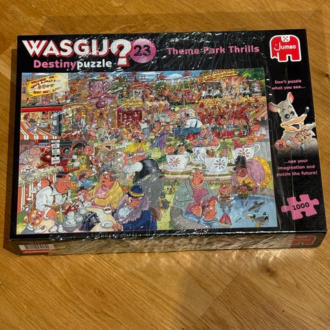 Jumbo Wasgij pussel med 1000 bitar. Pusslet har olika motiv inklusive vinterspel, jul och andra scener. Tillverkat av kartongmaterial.