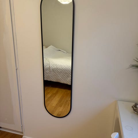 Spegel med rektangulär form och ram i ljus färg. Passar för användning i hemmet för att spegla och förstora rummet visuellt. 160 cm i höjd och 40cm i bredd.