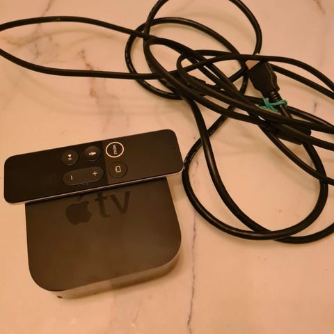 Apple Apple TV digital mediaspelare med fjärrkontroll. Enheten används för att strömma digitalt innehåll till en TV och levereras med strömkabel och fjärrkontroll.