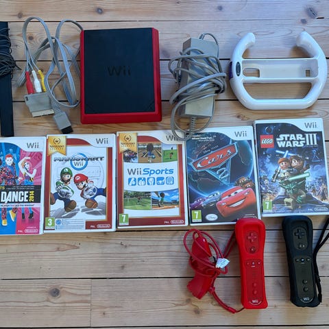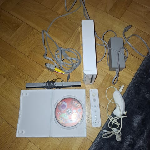 Nintendo Wii spelkonsol med handkontroller, sensorer och kablar. Paketet inkluderar flera spel, bland annat Just Dance, Mario Kart och We Sing. Konsolen är kompatibel med Wii-spel och tillbehör.