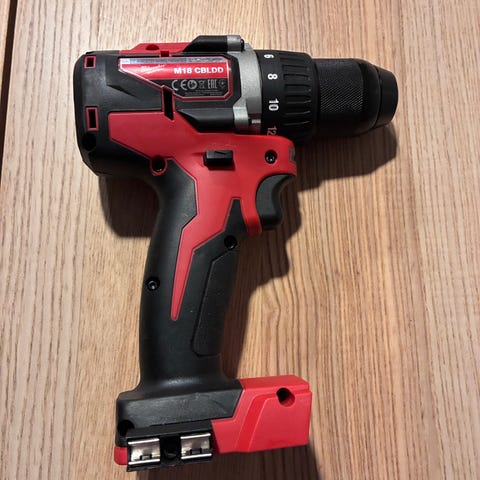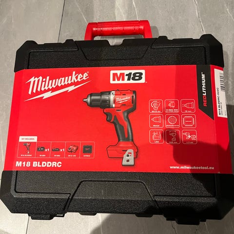 Milwaukee M18 borrmaskin och slagskruvdragare set inklusive två batterier och en laddare.