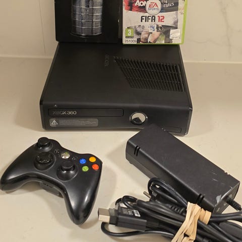 Microsoft Xbox 360 spelkonsol inklusive två trådlösa handkontroller, strömkabel, fjärrkontroll och flera spel. Konsolen är svart och kompatibel med Xbox 360-spel.
