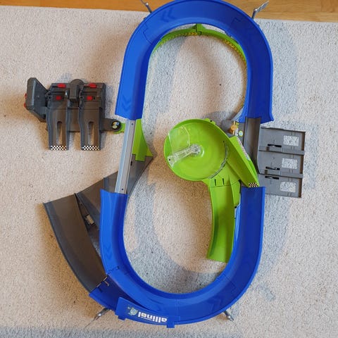 Hot Wheels barnleksak med loop och bana i orange och blå färg.