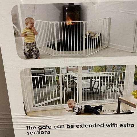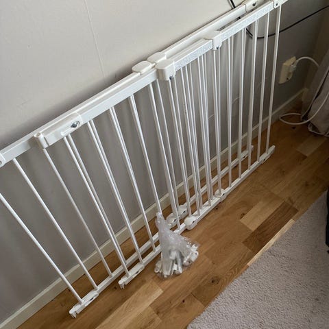 barnsäkerhetsgrind i vitt utförande. Används för att skapa en säker miljö för barn genom att begränsa tillgång till trappor eller andra områden i hemmet. Ca 67 cm hög. Justerbar till öppningar som är mellan 62.5 och 106.8 cm