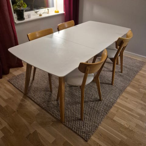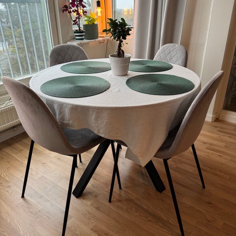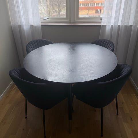 Säljer vår matgrupp pågrund av flytt! Det är inköpt på Mio för ca 5år sedan. Det finns några repor på bordsskivan, ca 14-30cm smala sträck (se bild) (vi har haft en rund duk över) de fyra stolarna är i grått sammet med ”diamant” stygn på baksidan och slätt på insidan. Bordets omkrets är 110cm och höjden är 73,5cm. Bord och stolar sälj tillsammans ej separat!