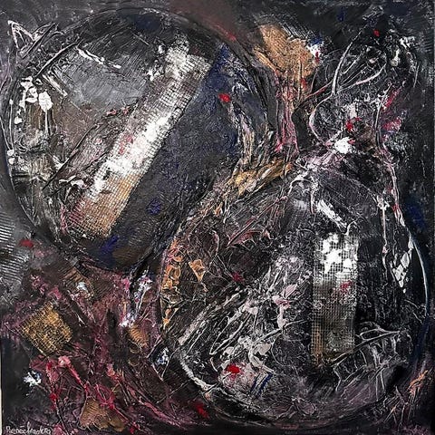 Abstrakt konstverk på duk med mörka och varma färgtoner, inklusive svart, vitt, orange och brunt. Målningen har en texturerad yta och är monterad på en metallram för industrilook.