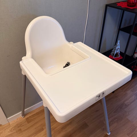 Medföljer bricka, babyinsats. Har hjul och flera lägen för höjning/sänkning och lutning. Fällbar.