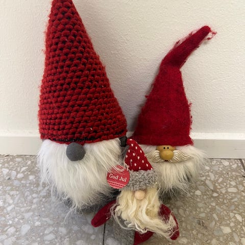 En charmig och unik juldekoration föreställande en jultomte som åker skidor bredvid en röd blomkruka.