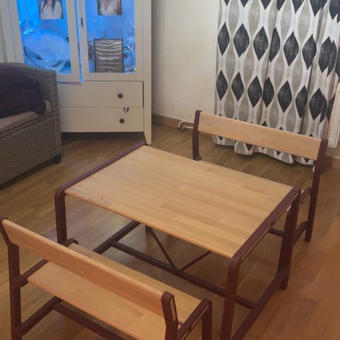 Fina små barnmöbler i trä. 2 st karmstolar och 2 st ”vanliga” stolar (stolarna är redan sålda).
