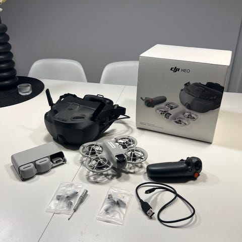 En DJI Neo drönare i nyskick med fjärrkontroll, batterier, förvaringsväska och massor av tillbehör.