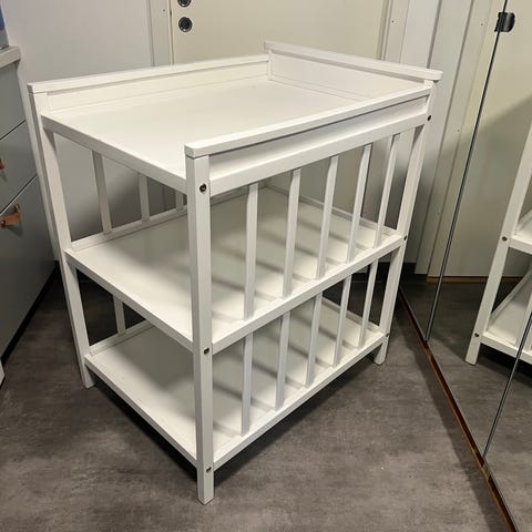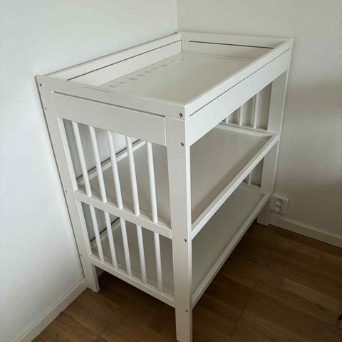 IKEA skötbord i trä med två hyllplan för förvaring och bekväm blöjbyte. Passar för barnrummet och är tillverkad i trämaterial.