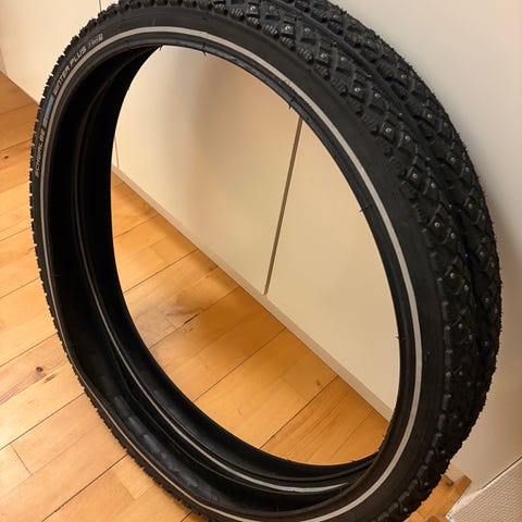 Dimension 35x622 för 28-tum. Väl använda, saknas ca 10 dubbar per däck, men då är ca. 230 kvar.