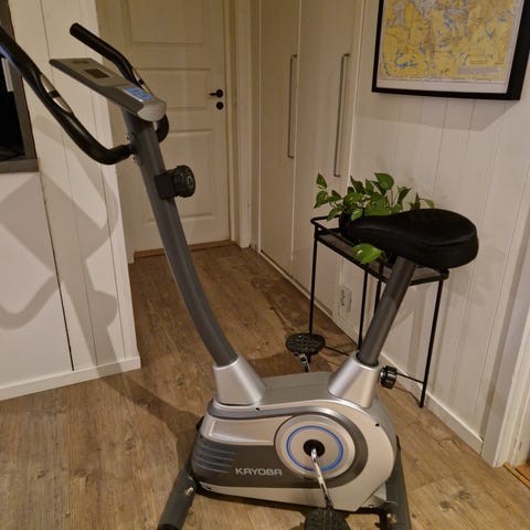 Kayoba motionscykel med display för att visa träningsdata. Utrustad med justerbart säte och handtag för bekväm träning. Passar för hemmabruk och konditionsträning.