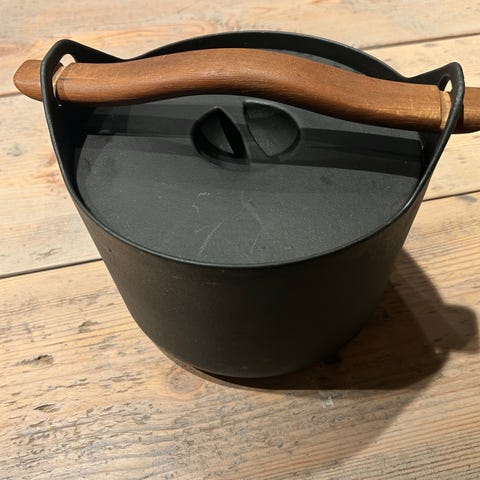 Tillverkad av tung emaljerat gjutjärn som tillagar mat både spis och ugn, passar även inuktionshäll.