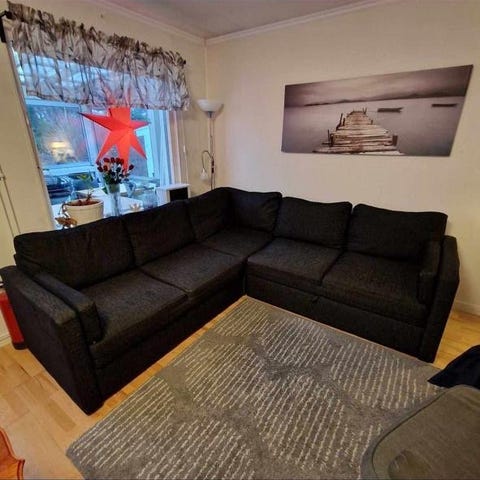 SÀljer en stor och rymlig hörnsoffa i mörkgrÄtt tyg. Perfekt för familjen, TV-kvÀllar eller som en extra bÀdd!