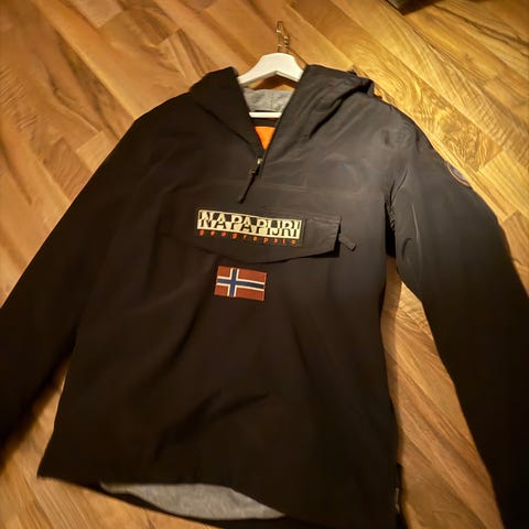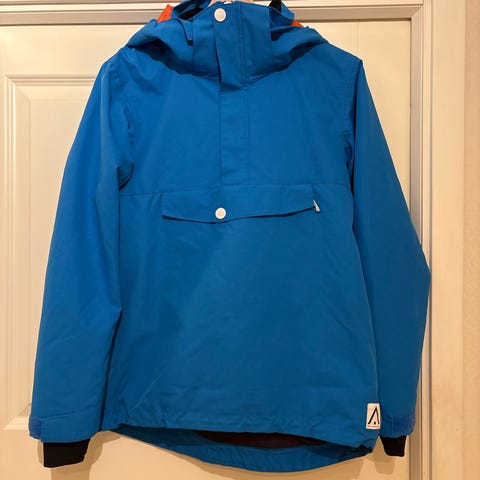 Grå snowboardjacka i storlek 162. Jackan är på insidan fordrad med ett fleecetyg och detta har blivit lite ruggat/noppigt vid tvätt och användning. I övrigt är jackan i bra skick och är hel.