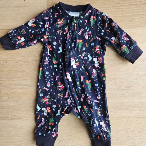 En tvådelad julpyjamas i storlek 158–164 samt en hel pyjamas/onepiece i storlek XS.