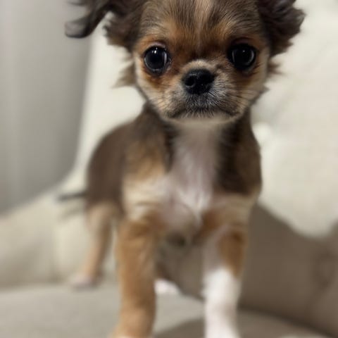 Pookie är en långhårig chihuahua hane, ca 1 år och 1 månad gammal. Han är en underbart go hund! Otroligt snäll, älskar att gosa och bli klappad och fungerar utmärkt med barn och andra hundar. Han kan dock vara lite skygg/osäker med nya personer i början och det kan ta en stund innan han vågar sig fram till nya, men när han väl vågat sig fram så lämnar han inte din sida! Vi har tyvärr inte möjlighet till att ha kvar honom då vi ska flytta till en lägenhet där det inte är tillåtet att ha hundar eller andra djur.