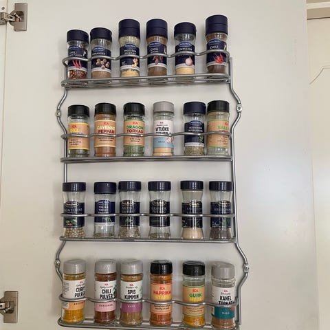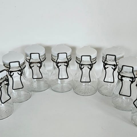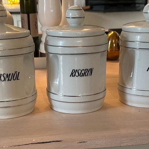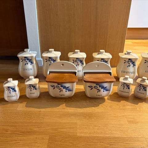 3 speceriburkar (+ extra lock) + 4 kryddburkar + 1 mjölbinge m trälock, porslin, Gefle ca 1920. De stora h=17cm (utan lock), de små h=9cm. En kryddburk krackelerad i den nedre delen (se bild), i övrigt i utmärkt skick