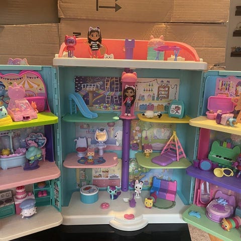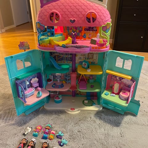 Gabbys dockhus Celebration, komplett med alla figurer förutom en liten lila tårta. Nypris 880kr