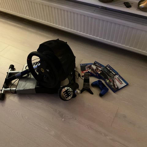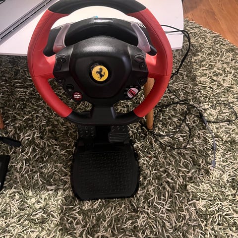 Thrustmaster T80 Ferrari racing wheel med röda och svarta detaljer, utrustad med paddlar för växling. Inkluderar pedalset med gas- och bromspedaler. Används för racing- och bilsimulatorer. Xbox Edison. Lädret har släppt lite grann på högersidan. Något som aldrig känns vid körning. Se bild 5