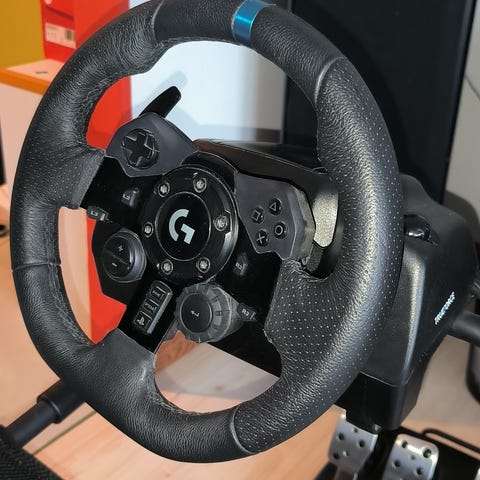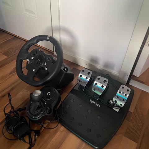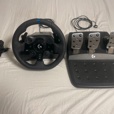 Logitech G923 racing wheel och pedaler. Komplett set med ratt, tre pedaler och växelspak. Används för simulering av bilkörning i spel och erbjuder realistisk körkänsla.