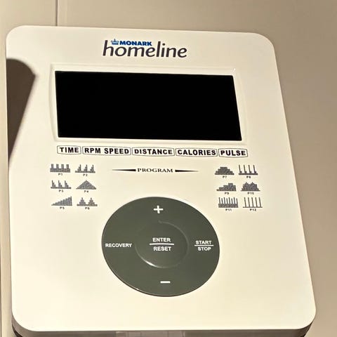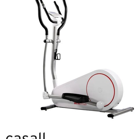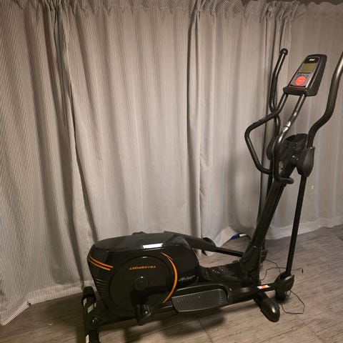 Crosstrainer i svart färg. Träningsmaskin för konditionsträning med stabil konstruktion och digital display. Passar för hemmabruk och erbjuder flera träningsprogram.