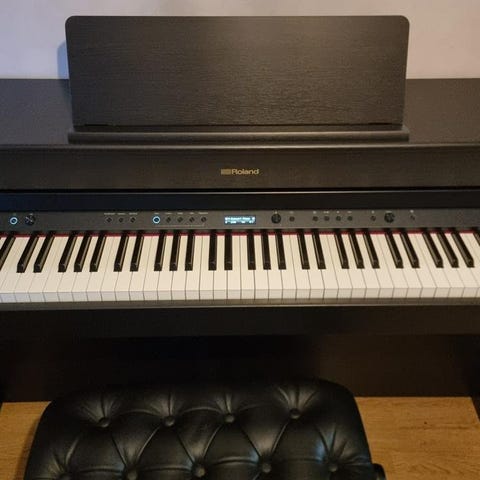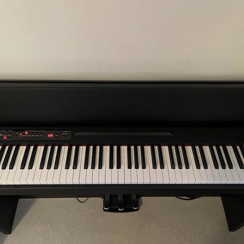 Säljer ett Yamaha elpiano P-70 i svart färg och i bra skick. Pianot har inbyggda högtalare men det går även att koppla in två hörlurar, vilket är perfekt för övning utan att störa andra. Med pianot följer ett genomskinligt pianonotsstativ som enkelt fästs på instrumentet, en äldre pianobok samt pedalen. Ett mycket bra elpiano med fin pianokänsla och ljudkvalitet, passar både nybörjare och mer erfarna spelare. Pris 1900 kr. Hör av dig vid intresse.❤️🥰