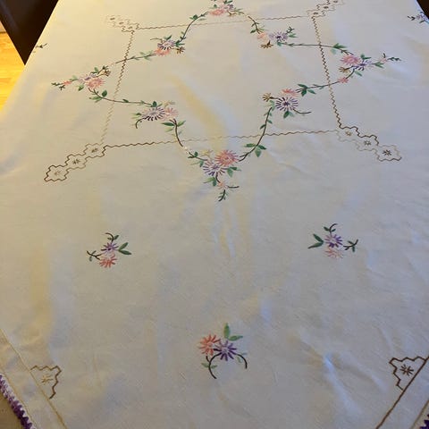 Säljer denna helt underbara bordslöpare. Med mycket fint mönster med fina sydda blommor och blad och med spets. Duken är i nyskick inga fläckar eller skavanker. Kom och titta på den bor I tullinge riksten botkyrka mvh Marita Mikkola