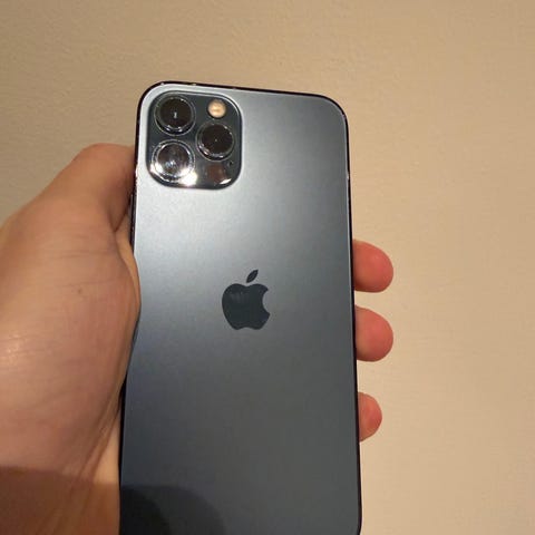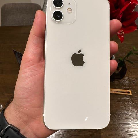 Apple iPhone 12 Pro med 128 GB lagringskapacitet i vit färg. Telefonen levereras med originalförpackning och tillbehör inklusive laddare och kablar. Skärmen är i gott skick och visar aktuell batterikapacitet på 78%.