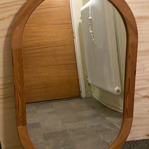 Dekorativ spegel i träfönsterkarm med vacker patina. Indelad i tre sektioner som ger ett klassiskt och lantligt uttryck. Perfekt som blickfång i hall, vardagsrum eller sovrum. Stadig och i fint skick.