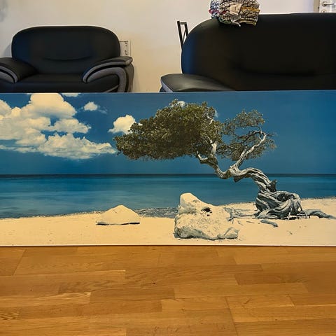 IKEA Väggdekoration med motiv av en strand med blå himmel, hav och en palmstam. Passar för väggmontering och ger en dekorativ bild av en naturmiljö.