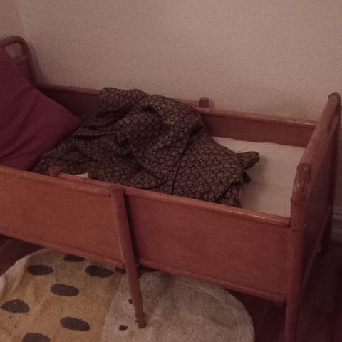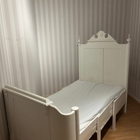 Äldre vitmålad Växasäng, rejäl & gedigen i trä.