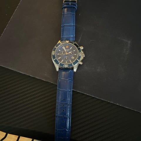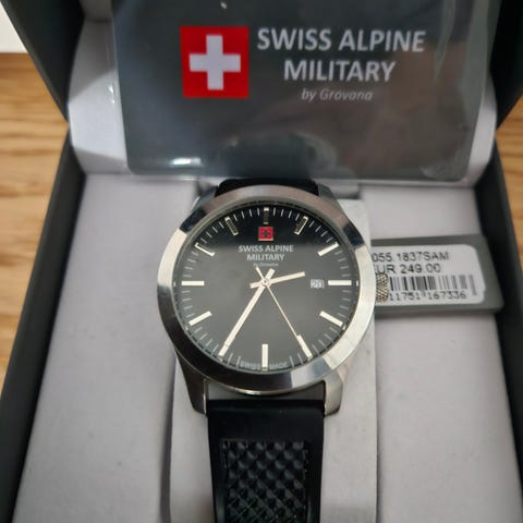 Swiss Military Hanowa klocka med brunt läderarmband. Klockan har en rund urtavla med tydliga siffror och datumvisning. Armbandet är i brunt läder med vit söm.