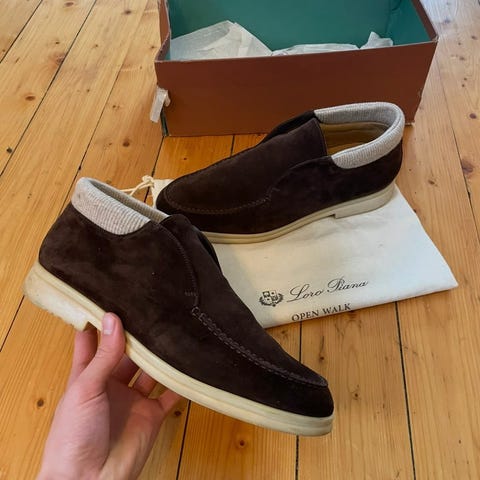 Säljer ett par Loro Piana Open Walk i svart hjortläder. Väldigt mjuka och bekväma – perfekt “quiet luxury”-sko som funkar till allt från jeans till mer uppklätt.