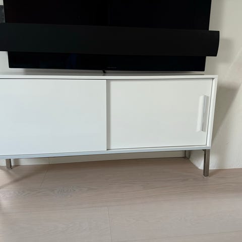 Tv- bänk från Mio med fyra lådor och ett hyllplan i mitten. Mått: längd 149,5 cm och bredd 42 cm.
