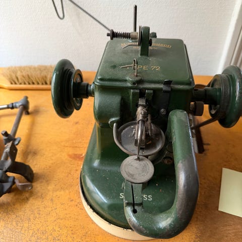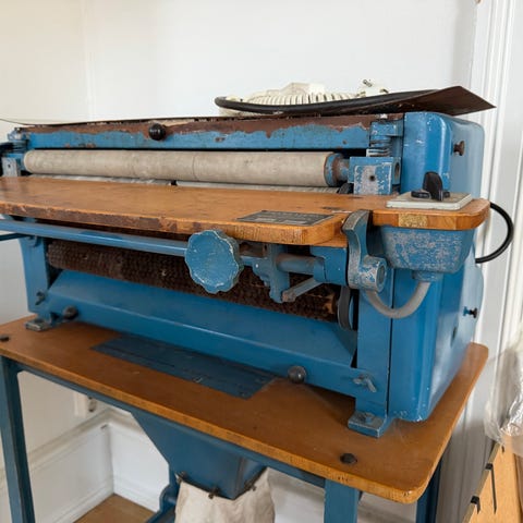 Gunda Modell 5 mangelsystem med trä- och metallkonstruktion. Används för att mangla textilier och tyger.