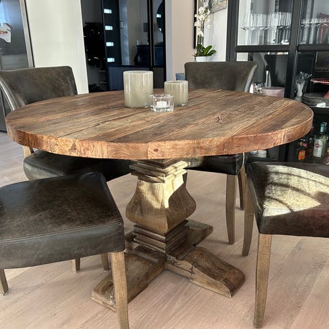 Flyttrensning 🌿 mycket fint runt matbord tillverkat av en enda hel träskiva (180 cm) – ovanligt och svårt att få tag på. Gediget hantverk och vacker trästruktur.
