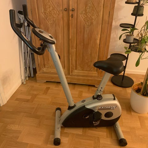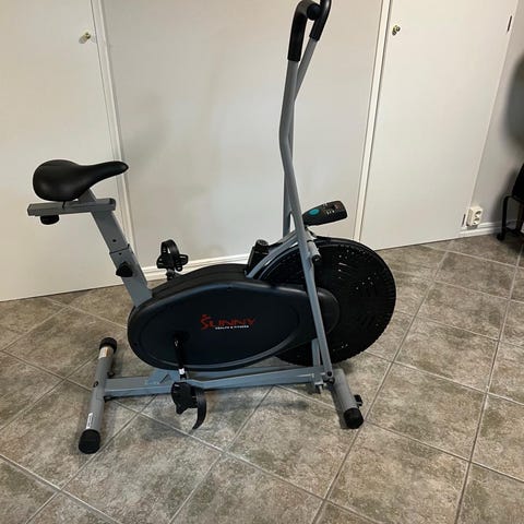 Motionscykel med integrerat justerbart bord. Cykeln har en bekväm sits och fotpedaler, samt ett bord som kan justeras i höjd för ergonomisk användning. Lämplig för användning i hemmet eller på kontoret för träning under arbetet.