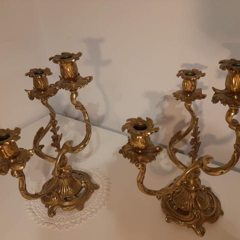 Ett par äldre franska ljuslampetter i förgylld brons/mässing, utförda i rokoko / Louis XV-stil, daterade till andra hälften av 1800-talet (ca 1850–1880).