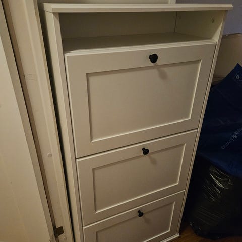 Säljer ett skoskåp från IKEA, modell Brusali, som är ommålat i färgen Antikgrå från Jotun. Knoppar ingår ej.
