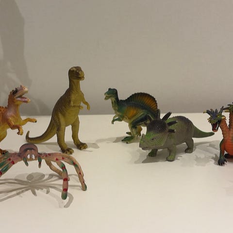 Samling av olika dinosauriefigurer och tillbehör i plast. Inkluderar flera olika dinosauriearter samt träd och byggnader som tillbehör. Lämplig som leksak eller samlarobjekt.