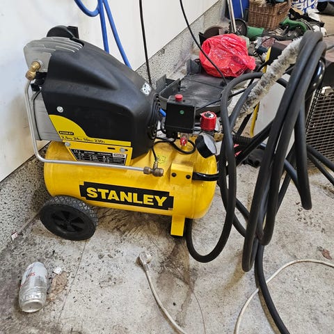 Kompressor Stenley 6 L oljefri, har varit uppackad och testkörd 1 gång. Ingår tillköpta tillbehör, slang, blåsmunstyke och luftklocka . Skickas inte, avhämtning gäller.