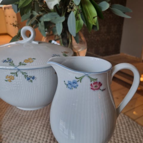 Rörstrand servis i porslin med kanna, sockerskål, koppar m fat och assietter.