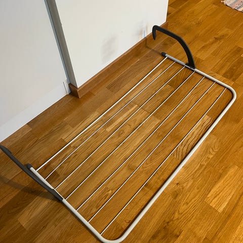 Torkställning tillverkad i metall och plast med flera torknivåer för kläder. Designad för att kunna fällas ihop för enkel förvaring och transport. Nypris 500kr, kom med bud!