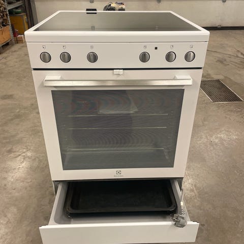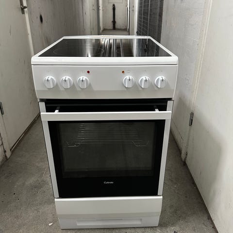 Cylinda glaskeramikspis med häll och ugn. Vit färg och flera vred för inställning av värme och funktioner. Ugn med glaslucka och inre belysning. Spisen är avsedd för matlagning och bakning.