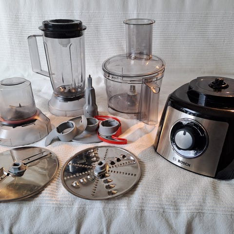 Bosch MultiTalent 8 matberedare i vit färg. Utrustad med flera tillbehör för olika matberedningsuppgifter, inklusive visp och skivverktyg.