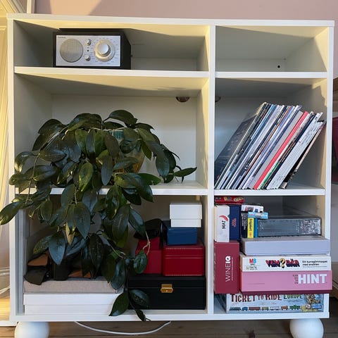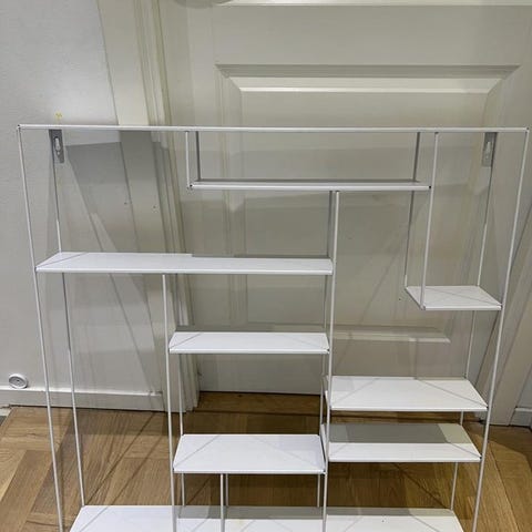 säljer ett par hyllor som kan konfigureras på olika sätt. jag har haft dem i ett hörn samt på en fristående vägg enl bilder.