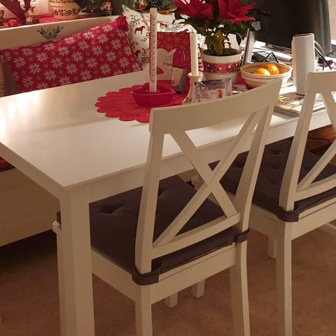 Barnmöbel set bestående av ett runt bord och två stolar i vit färg. Stolarna har ryggstöd formade som kaninöron och renhorn. Trä, högkvalitet men väl använda. Fint helhetsintryck men märken efter lek, se bilder.